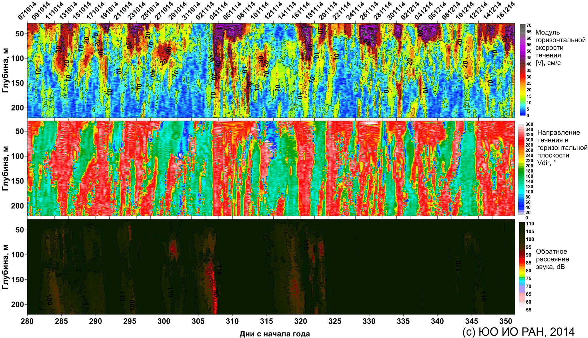 Вертикальные разрезы зондом "Аквалог" 10.07.2014 - 12.17.2014. Точка постановки траверс Толстого мыса Геленджикской бухты 44°29, 345’ с.ш., 37°58, 44’ в.д. Глубина места 270 м, глубина постановки 250 м. Периодичность измерений 6 часов. Измерительное оборудование: СТД-зонд Idronaut 316, акустический измеритель скорости течения Aquadopp 2 мГц