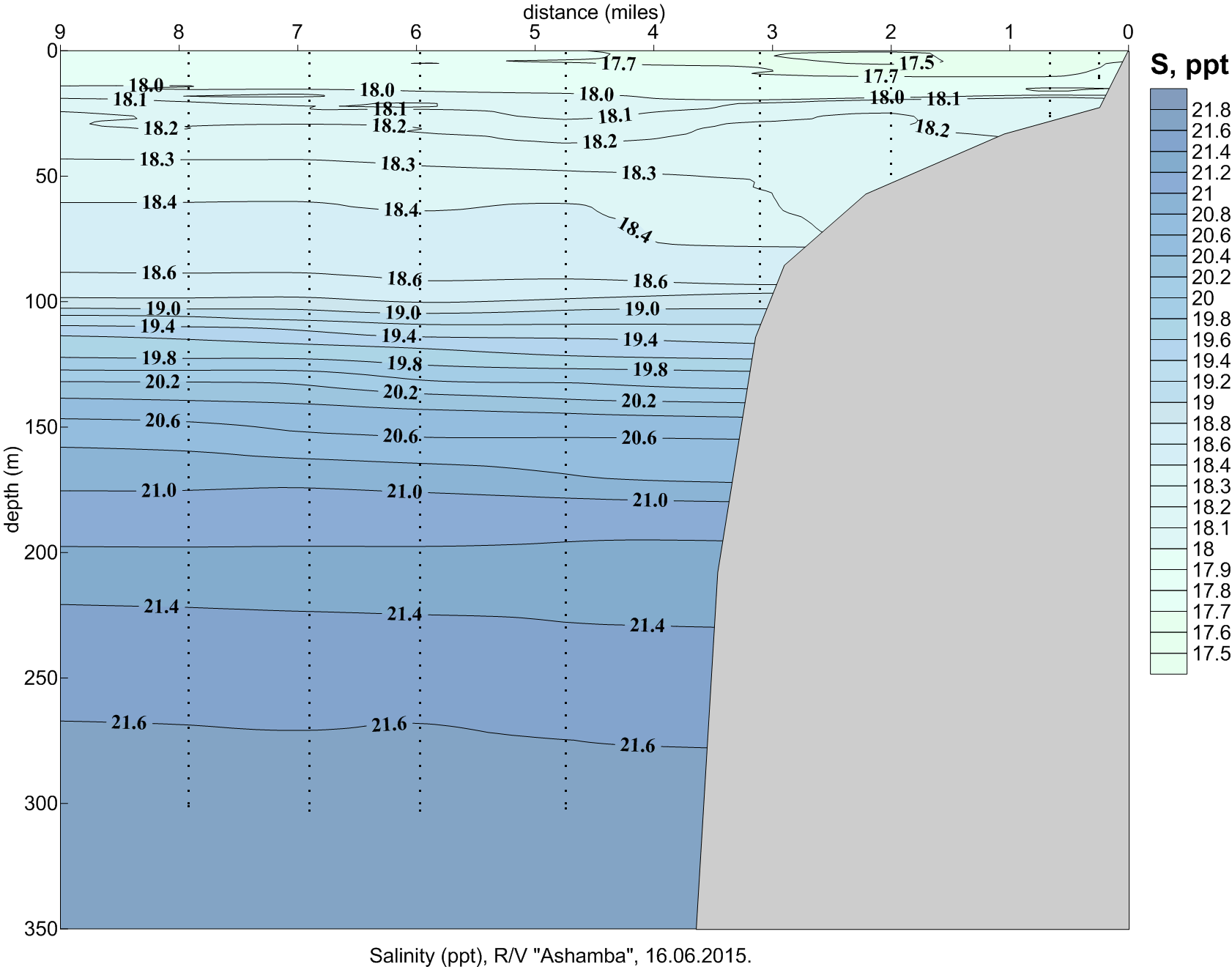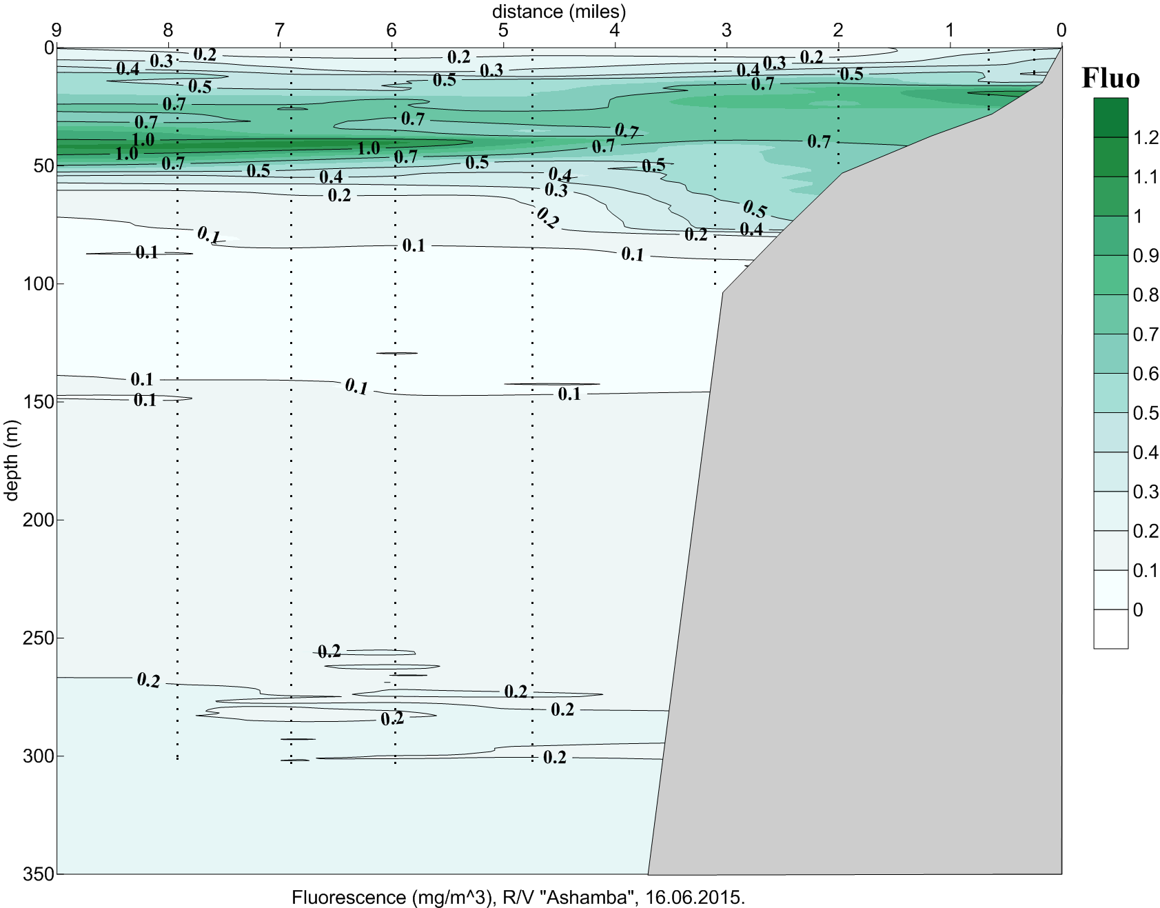 Измерения проводились на 8 станциях, до дна на шельфе и до 300 м глубины за шельфом