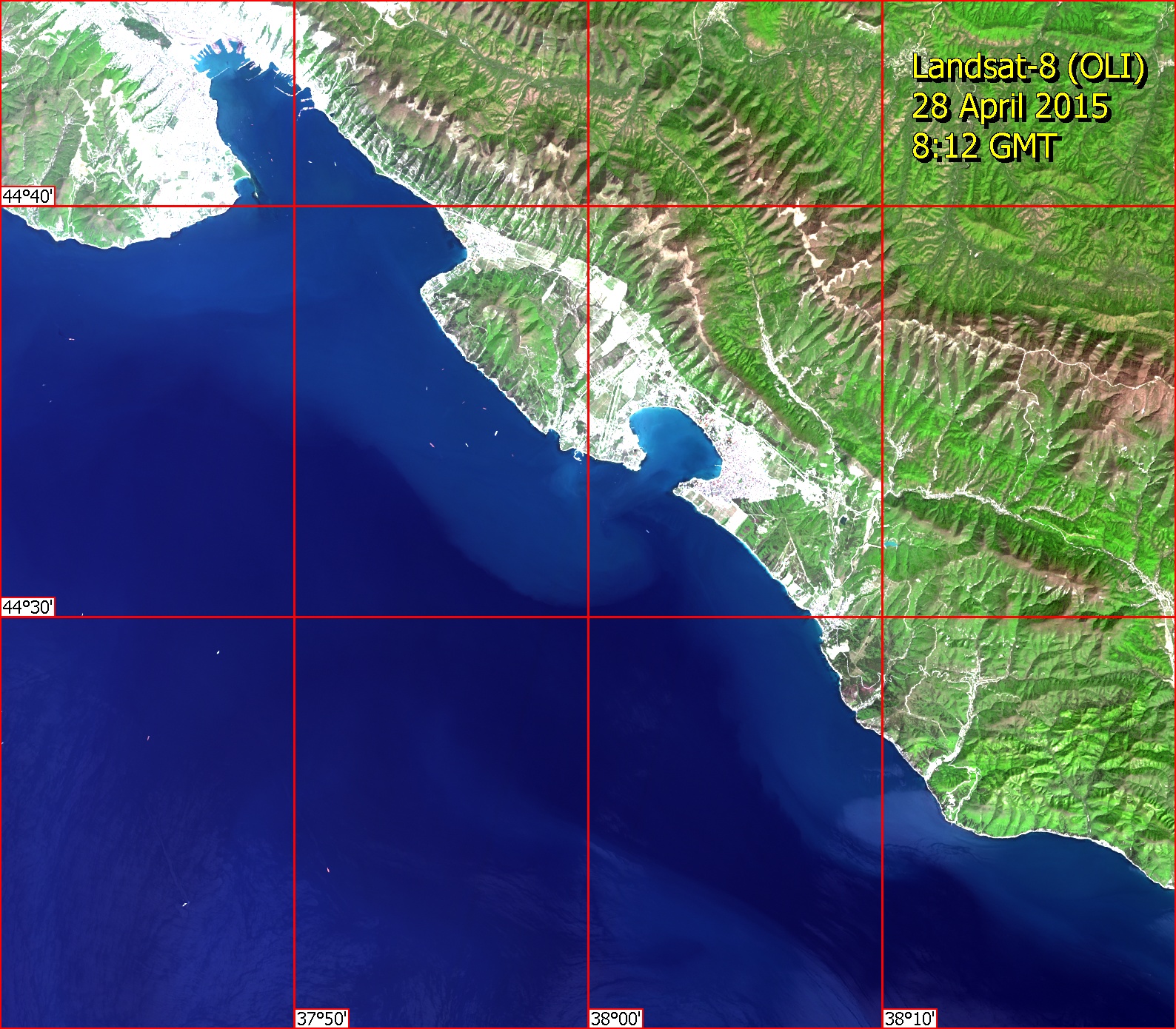 Съемка полигона 28.04.2015 8.12 GMT, Landsat-8 (OLI), рельеф и распределение температуры поверхности моря