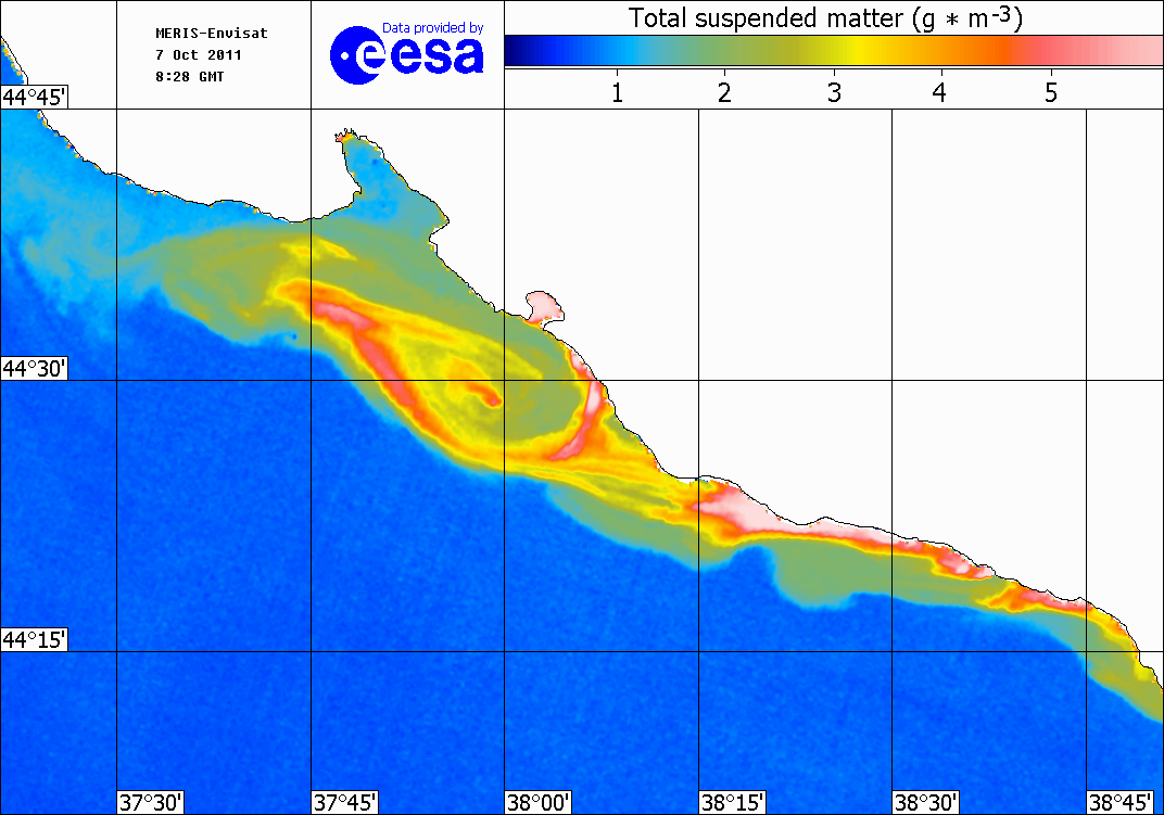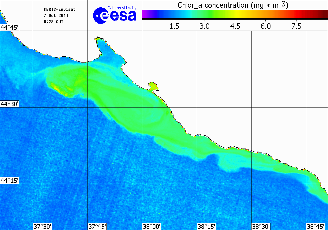 Съемка полигона 07.10.11 8.28 GMT, MERIS-Envisat, расределение хлорофилла и взвесей.