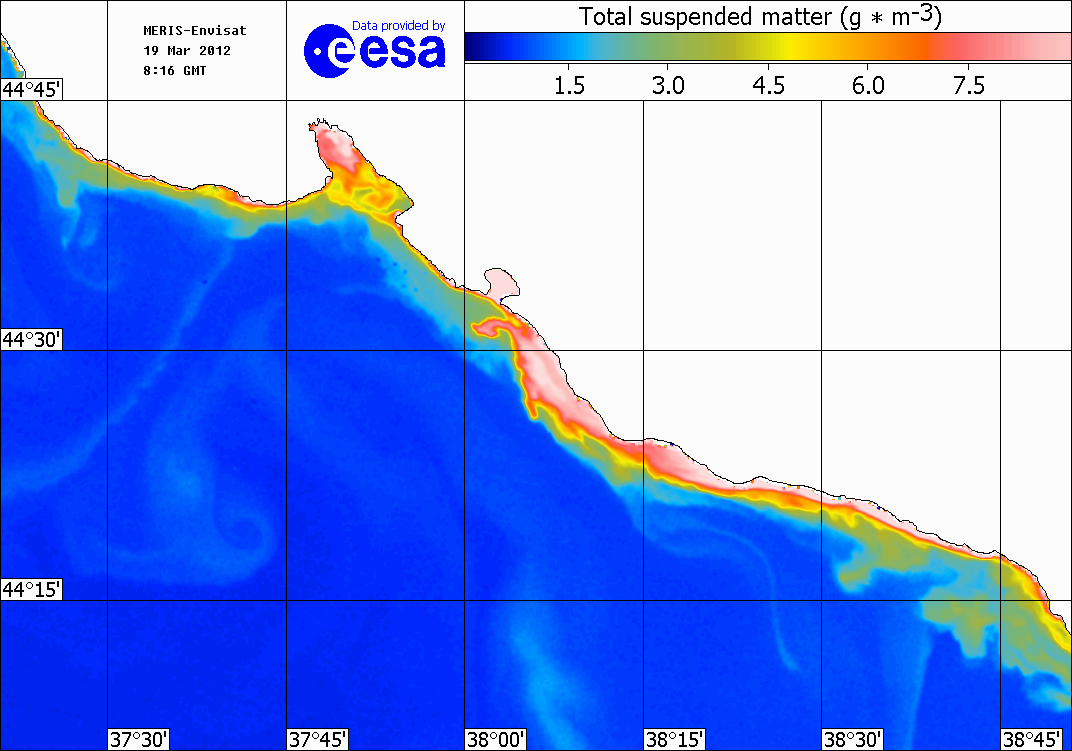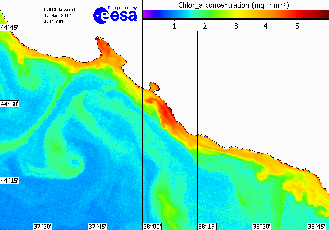 Съемка полигона 19.03.2012 8.16 GMT, MERIS-Envisat, расределение хлорофилла и взвесей.