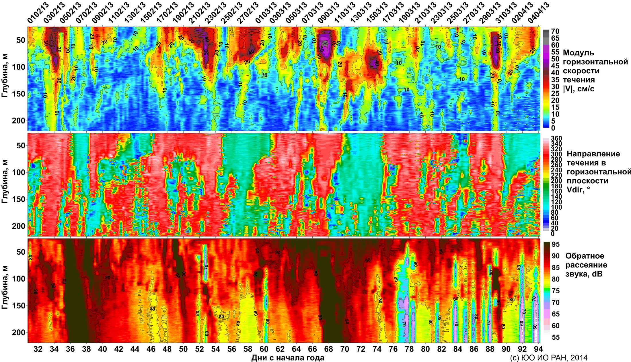 Вертикальные разрезы зондом "Аквалог" 01.30.2013 - 04.04.2013. Точка постановки траверс Толстого мыса Геленджикской бухты 44°29, 345’ с.ш., 37°58, 44’ в.д. Глубина места 270 м, глубина постановки 250 м. Периодичность измерений 6 часов. Измерительное оборудование: СТД-зонд Idronaut 316, акустический измеритель скорости течения Aquadopp 2 мГц